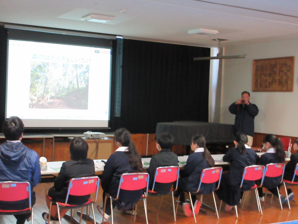 まず、森林の大切さについて お話を聞きました。森や林が消えてしまうことで、自分たちの生活に様々な影響が出てしまうこと等の話を聞き、あらためて緑の大切さを考えさせられました。