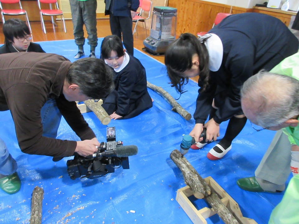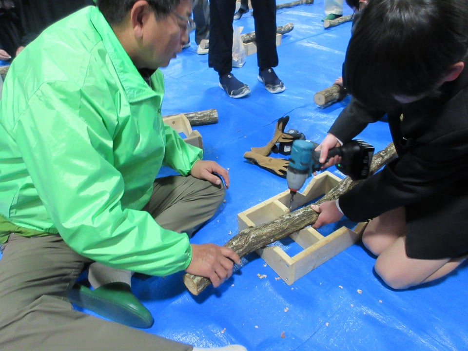 シイタケの駒打ち体験では、原木に10㎝くらいの間隔で穴を開け、そこに種駒を打ち込みました。はじめのうちは慣れない電動工具に悪戦苦闘していましたが、次第に要領よく作業を進めていました。今回は、種駒を打ち込んだ原木をブルーシートで包むところまでを行いました。