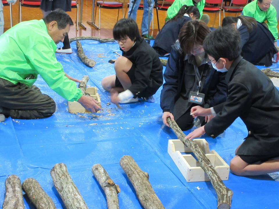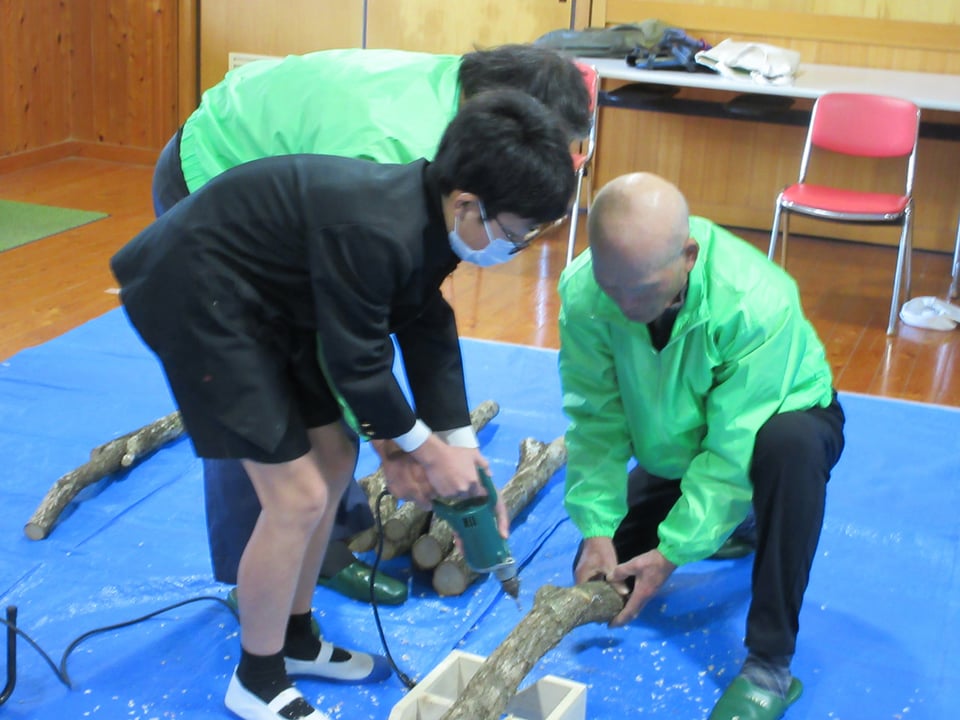 この日、山口県美祢農林水産事務所ならびに宇部市林業研究会の方にご来校いただき、シイタケの駒打ち体験をさせていただきました。