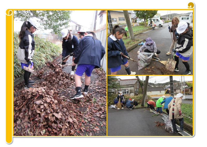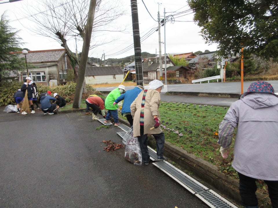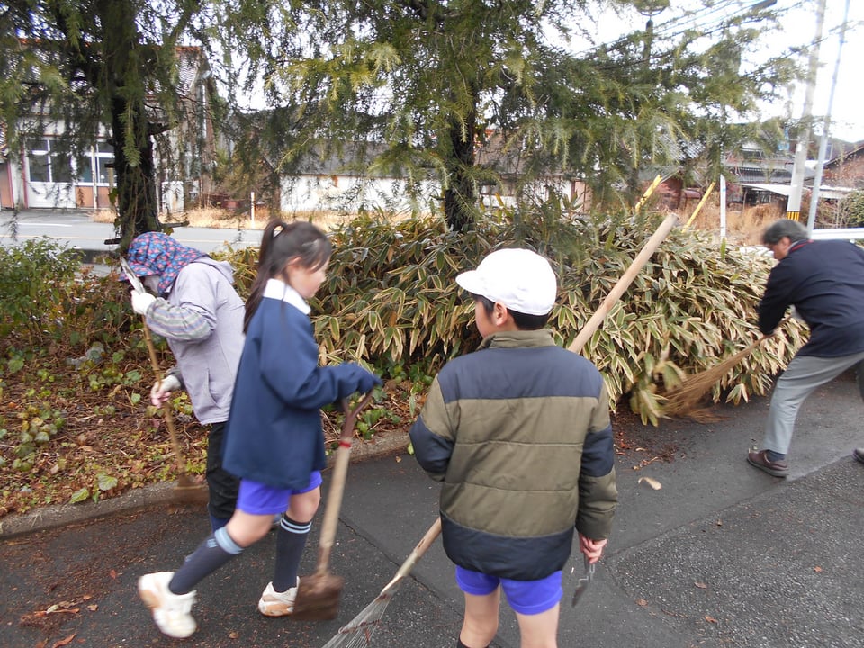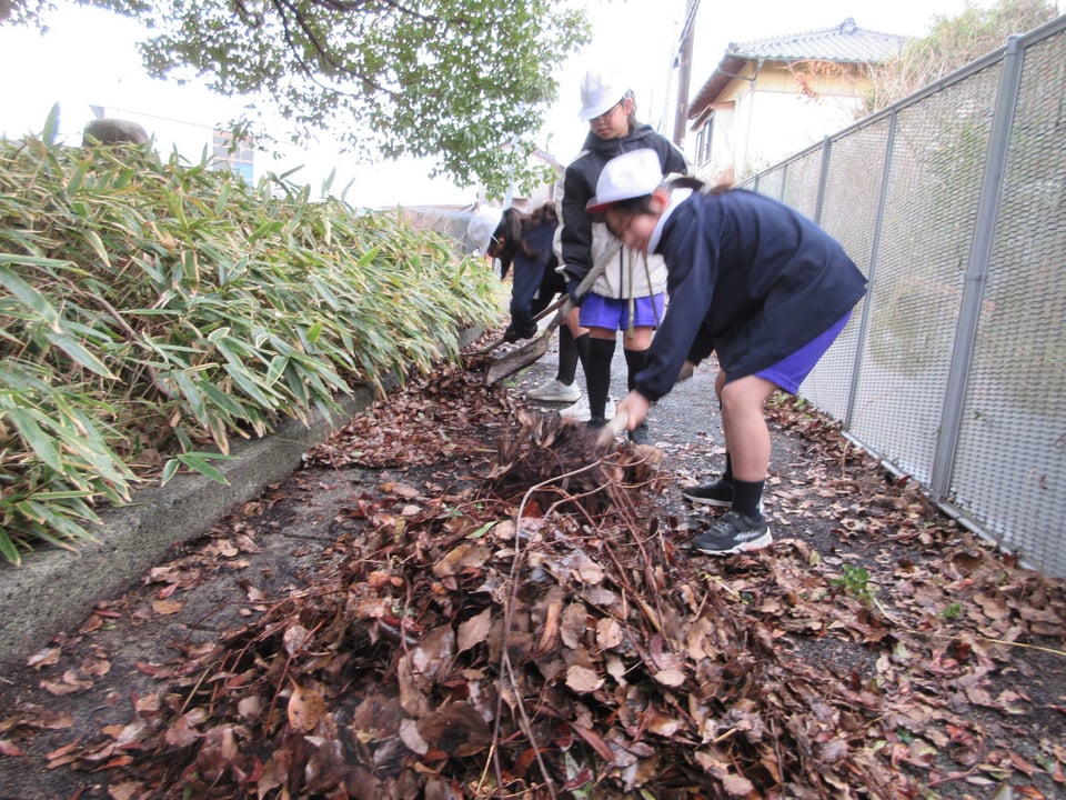 この日は、5年生も参加し、地域の「まちづくりサークル」の方と一緒に活動しました。溝にたまった落ち葉を集めたり、花壇の周りを竹ぼうきできれいに掃いたりしました。
