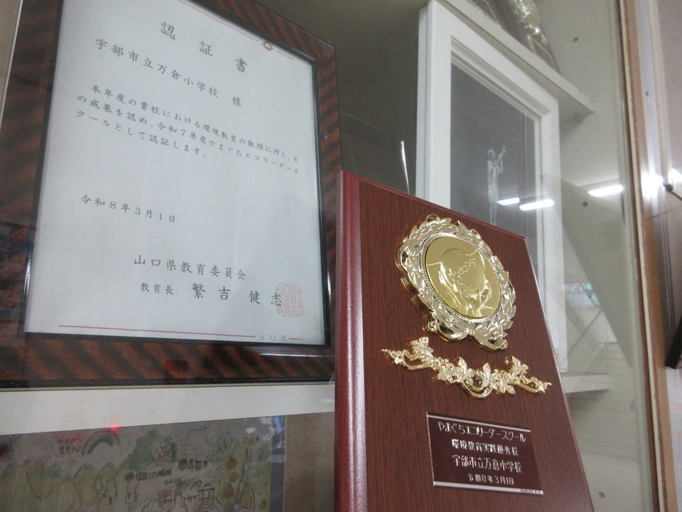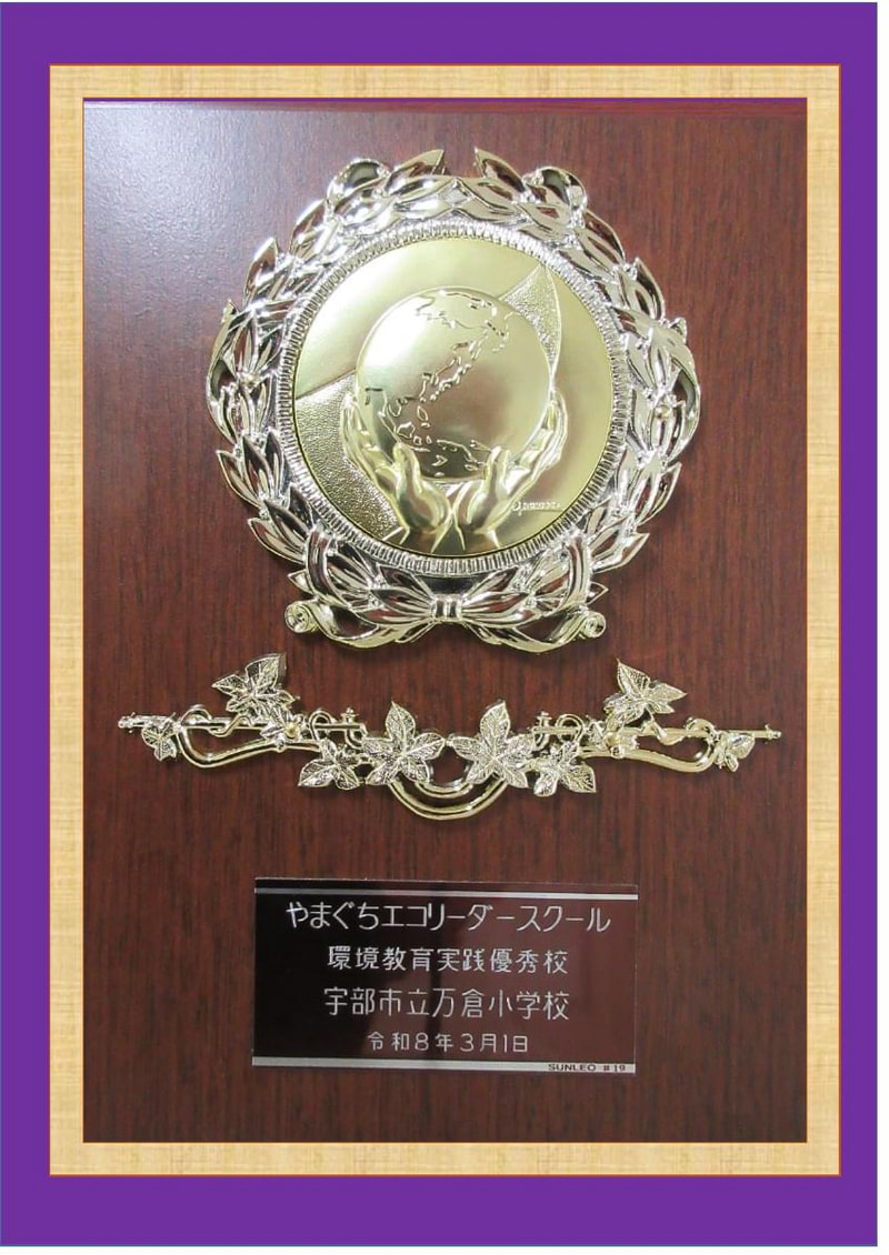 3月2日(月)、万倉小学校が環境教育の取組を進め、「エコリーダースクール」として認められた活動を10年間継続させたとして、山口県教育委員会から「環境教育実践優秀校」の表彰を受けました。