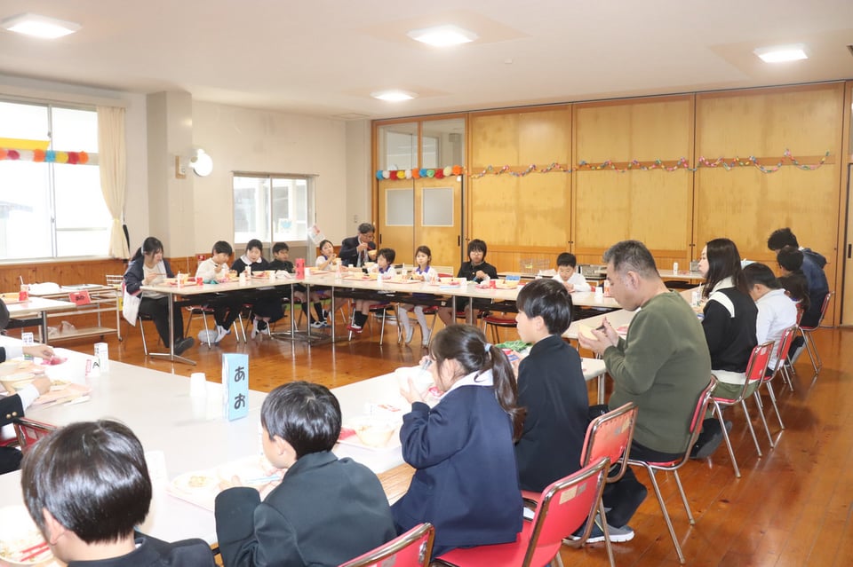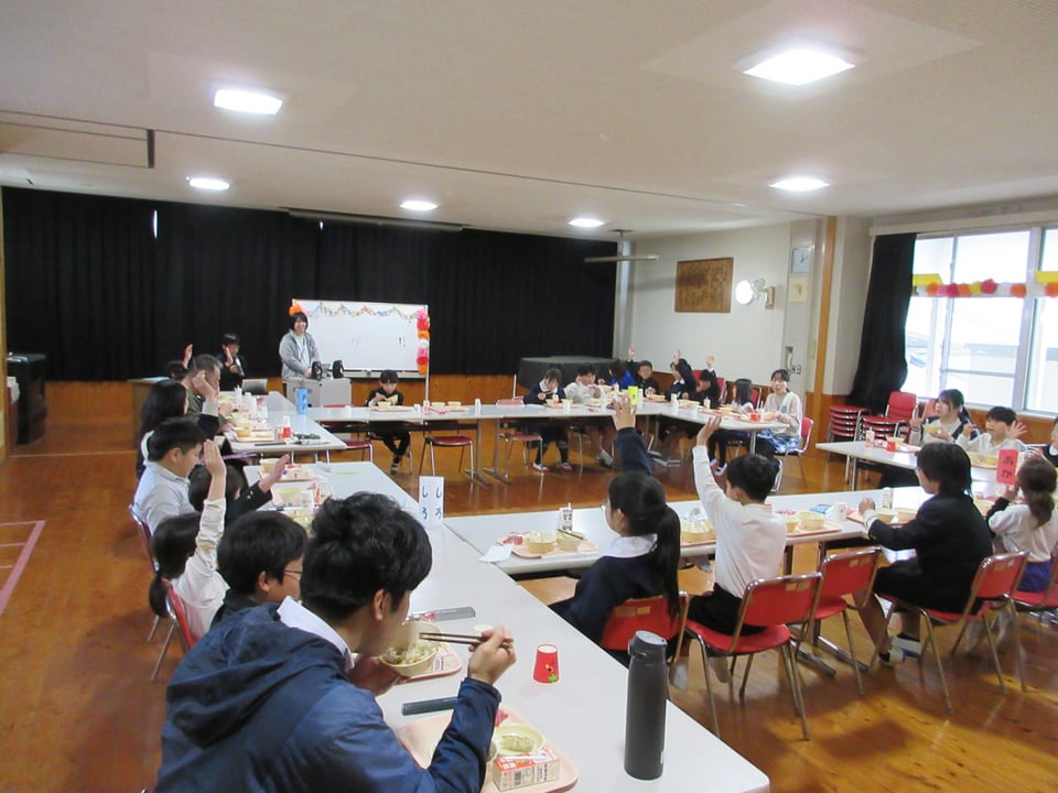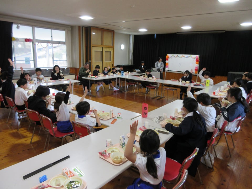 この日の給食当番は6年生以外の学年が行いました。多目的スペースは終始 なごやかな雰囲気で、来週 卒業を迎える6年生も、万倉小学校での全校給食をしっかり味わっていました。