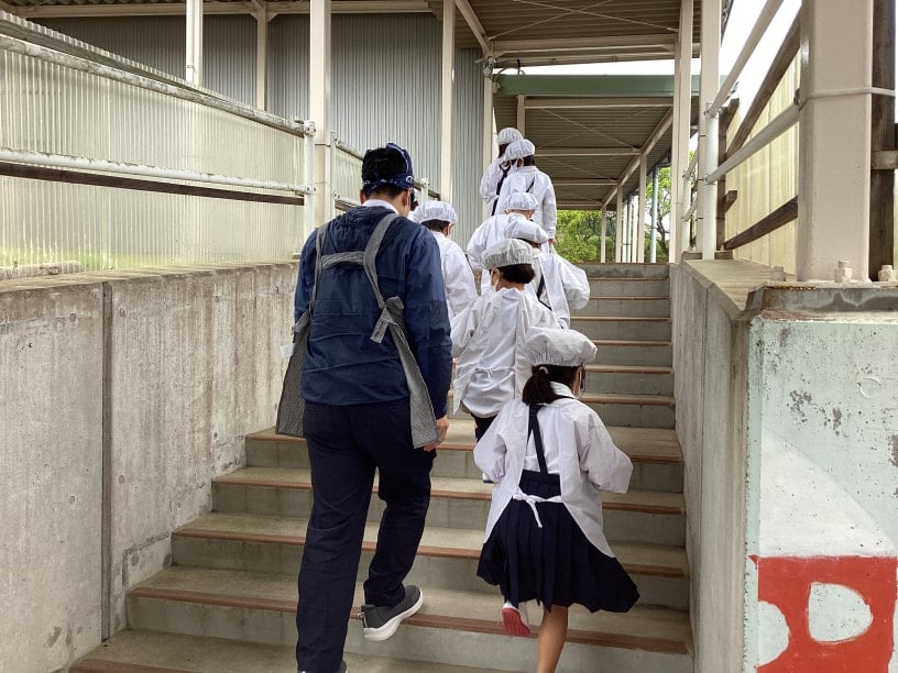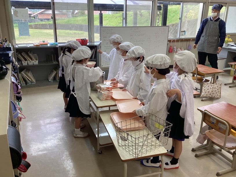 今週から給食が始まった1年生。2年生をお手本に、配膳等も始めています。