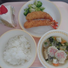 今日は、6年生の卒業をお祝いする「卒業祝い給食」でした。献立は、「ごはん、牛乳、お祝い汁、エビフライ、ブロッコリー、お祝…