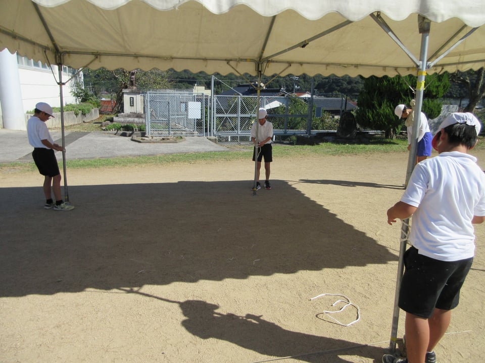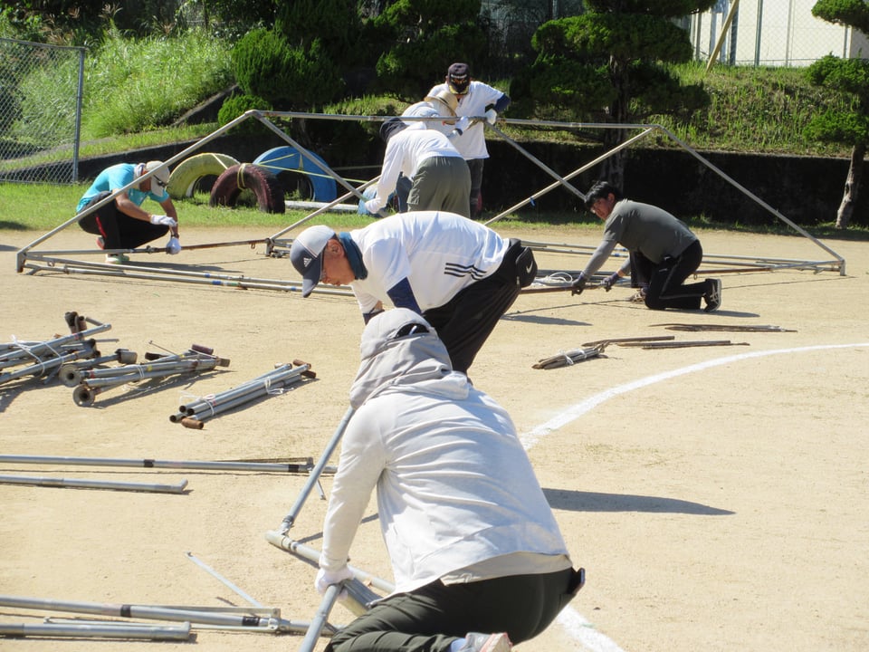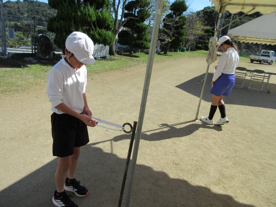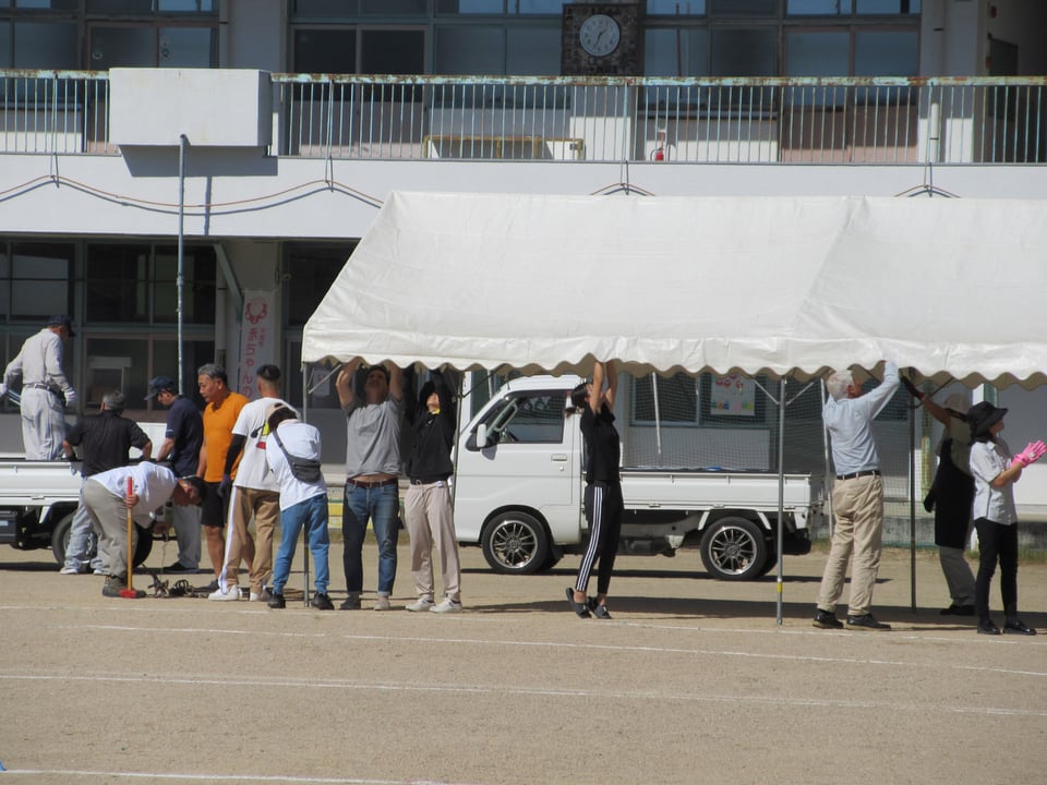 明日の「万倉小学校・万倉地区合同大運動会」に向けて、前日準備を行いました。体育振興会やPTAの皆様によって テント張りやくい打ち、競技に使用する準備物の用意が手際よく行われ、明日を待つのみとなりました。