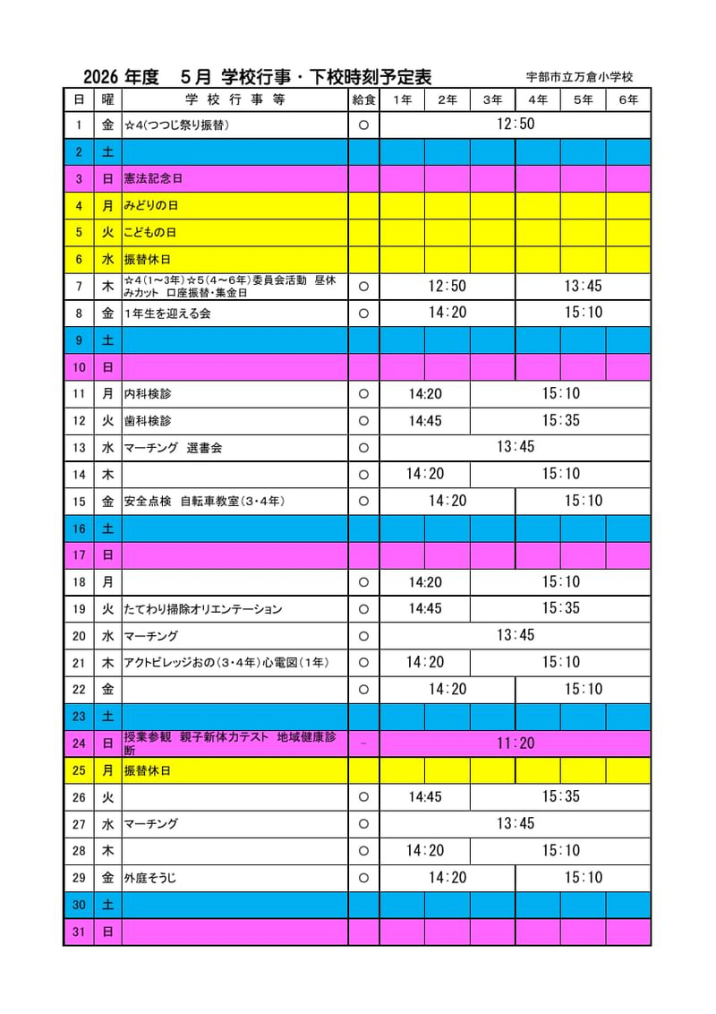 > 2026年 5月行事予定・下校時刻予定