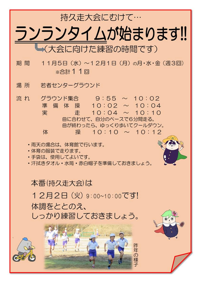 12月2日の持久走大会にむけて、来週から いよいよ「ランランタイム」が始まります。