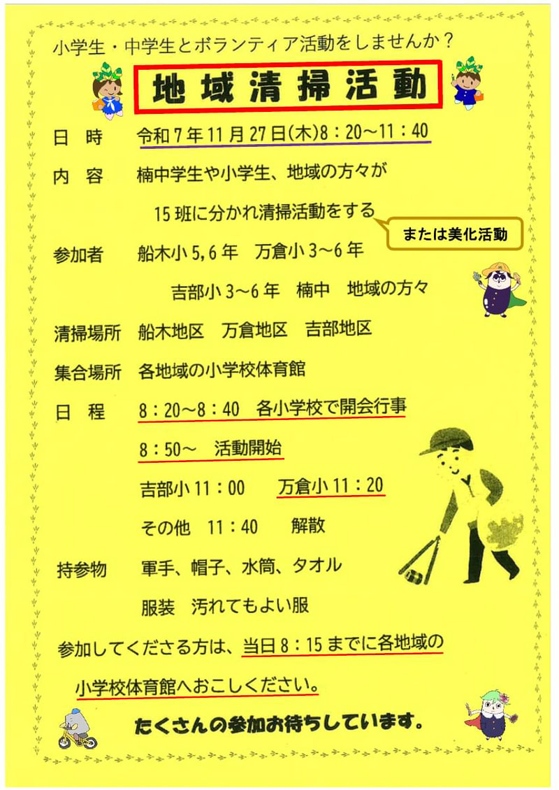 11月27日(木) 、楠中学校区内にて「地域清掃(美化)活動」を行います。小学生と中学生が協力して ふるさとをきれいにしようという活動です。(「We Love KUSUNOKI プロジェクト」の活動です)