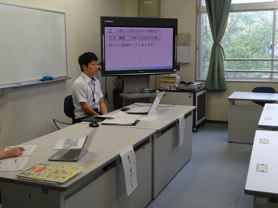 授業の後の研究協議会では、40分授業の指導について意見を出し合い、分析・整理していきました。蔵本先生からは子どもたちに委ねる指導の大切さを具体的な場面を通してご指導いただきました。