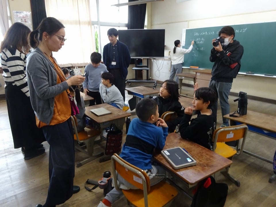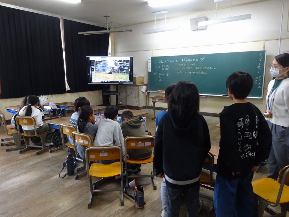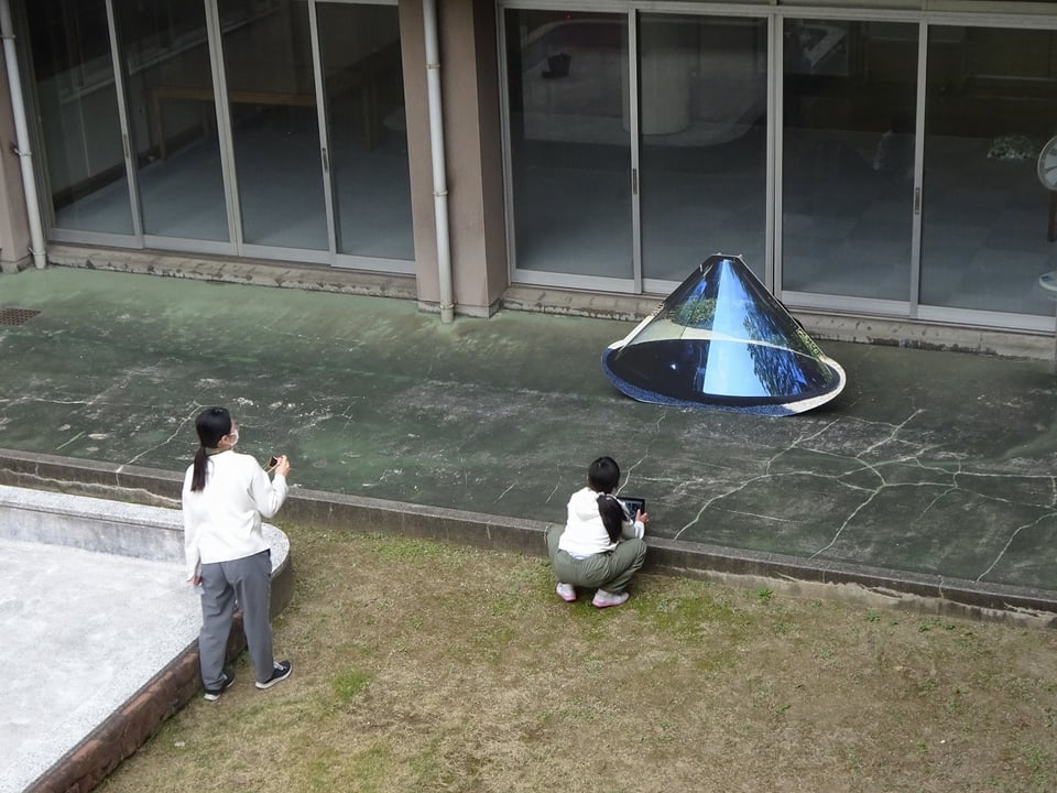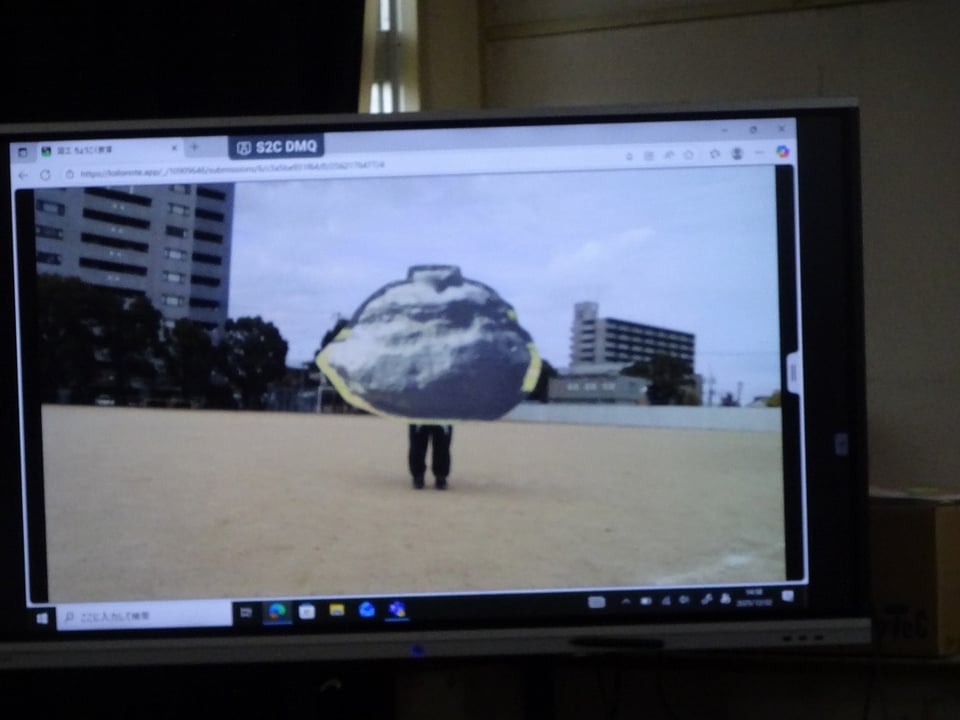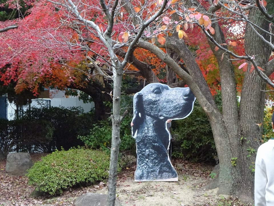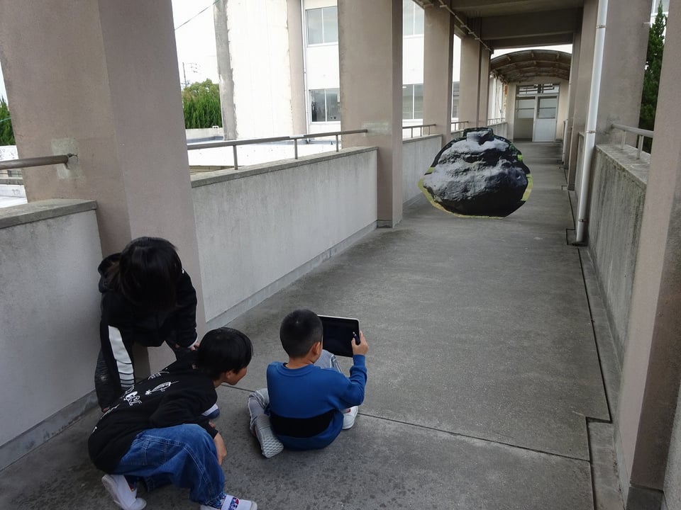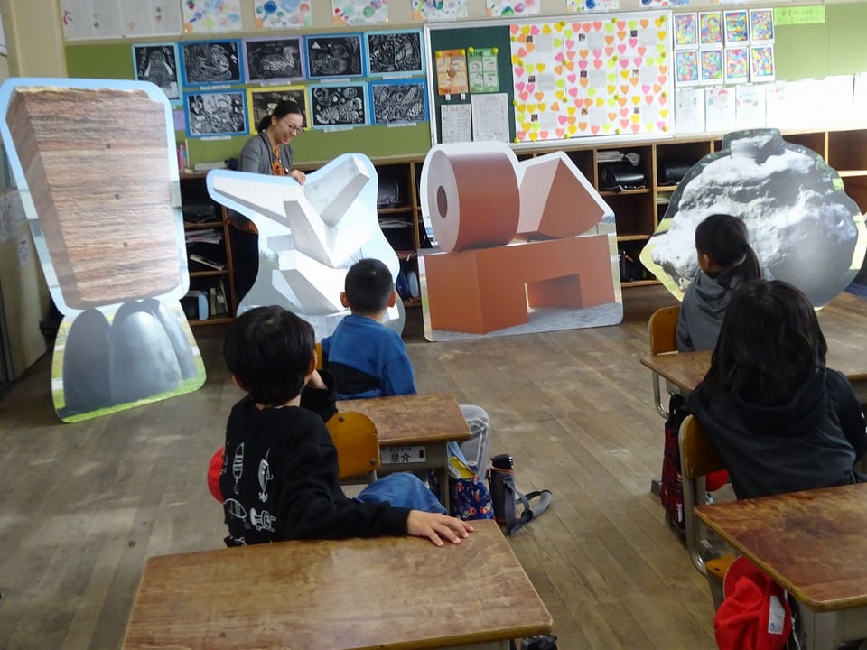 彫刻パネル設置体験は、宇部市の彫刻教育のプログラムで、大型の彫刻パネルをつかって鑑賞活動ののち、グループごとに学校内のお気に入りの場所に彫刻を設置します。設置した様子を写真撮影し、設置した理由や感じたことなどを発表して共有します。子どもたちは思い思いのパネルを選び、その彫刻に合いそうな場所を次々に選びながら設置していました。「紅葉の中に置くといいと思った」や「サッカーゴールに置くと、キーパーみたいに見える」などと理由を説明し、活動を楽しんでいました。