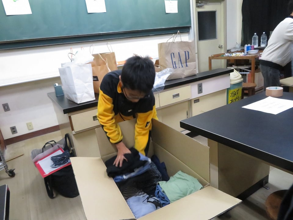見初小と同じく服のチカラプロジェクトに参加している宇部中央高校生に6年生が服の仕分け方やたたみ方を習いました。集まった子ども服を理科室に運び入れ、夏服・冬服・赤ちゃん用に仕分けをしていきました。子どもたちはタグを見ながらサイズを確認したり、送れないものがないか高校生に聞いたりして、仕分けました。仕分けができたら、いよいよ送るために箱詰めをしていきました。1着ずつ丁寧に、こころを込めて畳んで、箱に詰めていきました。これで、手順を習った6年生は、他の6年生や5年生に教えることができます。