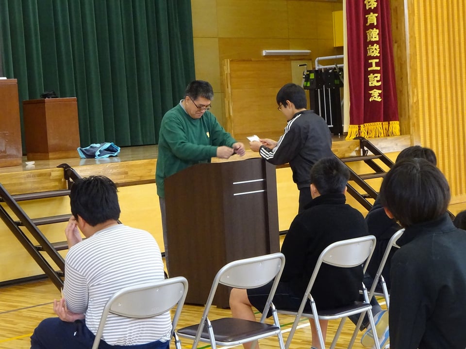 式には、同窓会より松本鉄己様、藤本直美様のご臨席を賜りました。まず、同窓会入会証書カードの授与が行われ、松本様より、卒業生一人ひとりの手へと丁寧に証書カードが手渡されました。