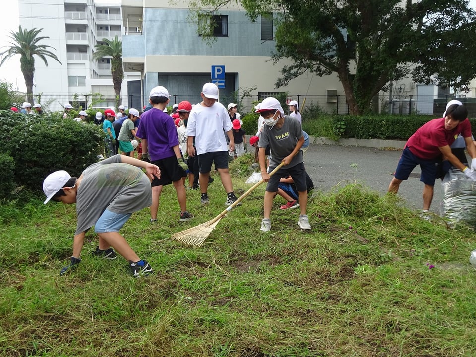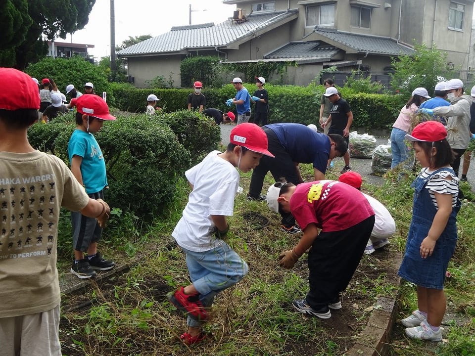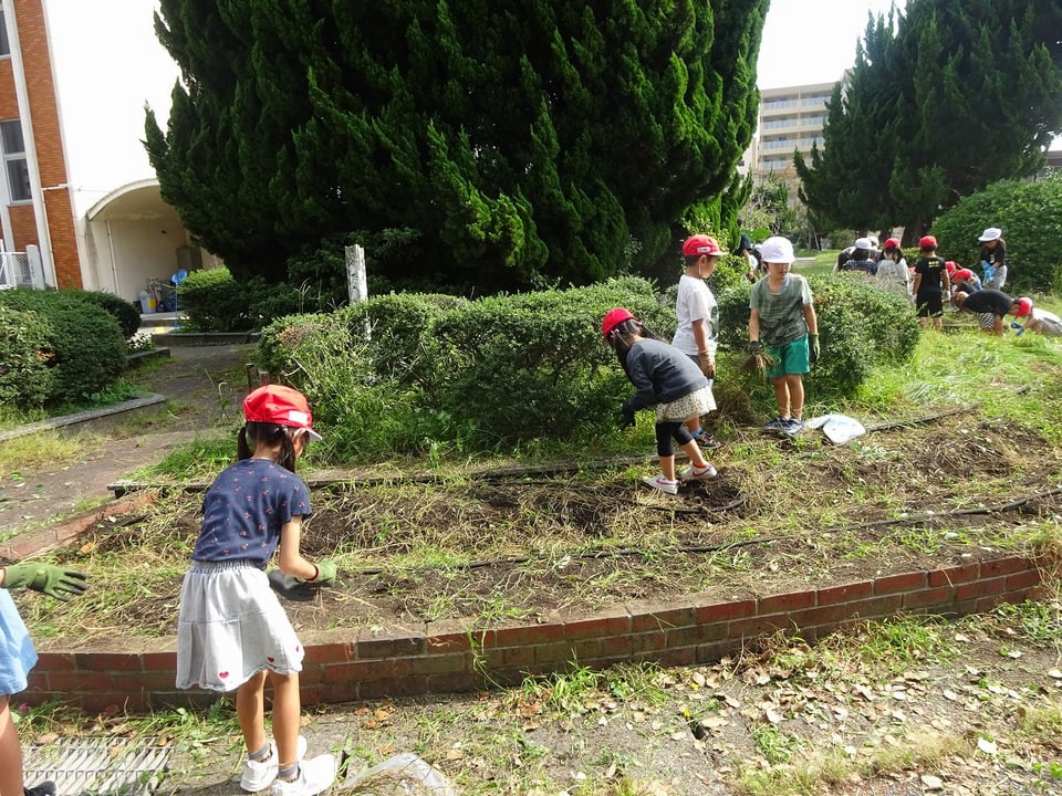 全校で秋の花を植える準備として、学校の花壇の花抜きや草抜きをしました。花も雑草も成長していて、みんなで、一生懸命に抜いていき、花壇がみるみるきれいになっていきました。初めての1年生も上級生のお兄さんやお姉さんを見習いながら、一生懸命に抜いて、袋に詰めていました。