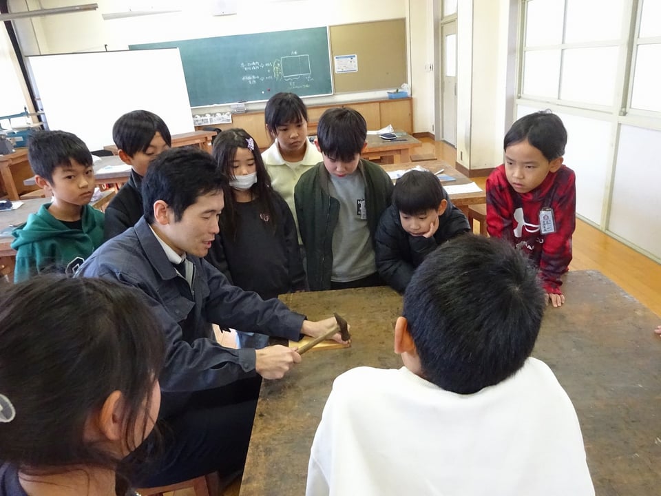 本日、3年生の図工「くぎ打ちトントン」の時間に、中学校から技術科の先生をお招きして出前授業を行いました。