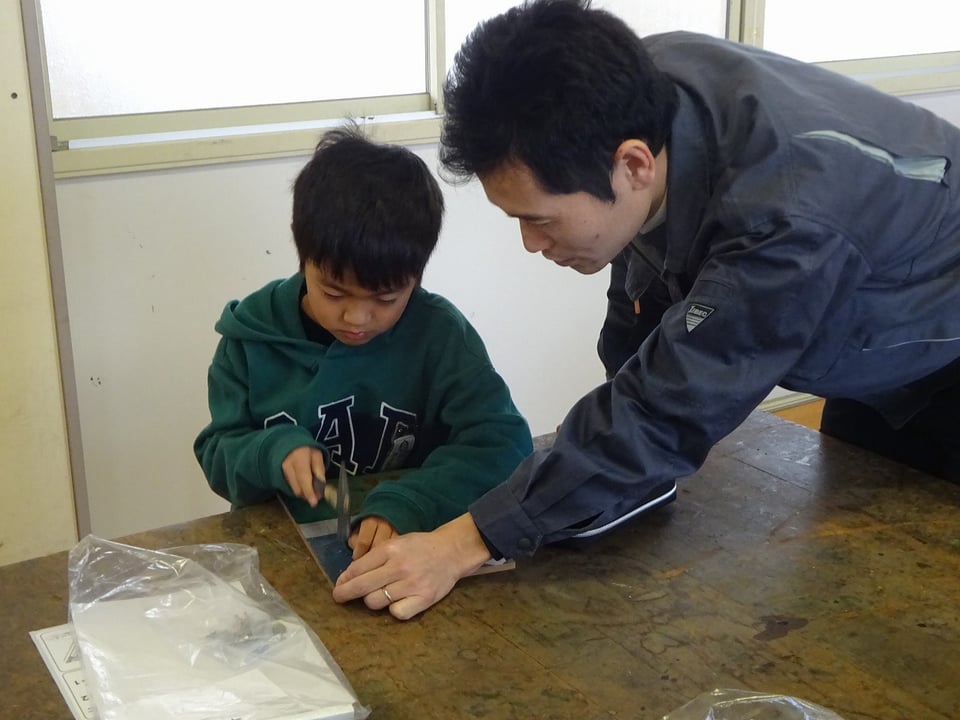 初めて金槌(かなづち)を手にする児童も多く、最初は緊張した面持ちでしたが、中学校の先生から「金槌のもち方」や「くぎをまっすぐ打つコツ」「安全な道具の使い方」を専門的な視点で分かりやすく教えていただきました。