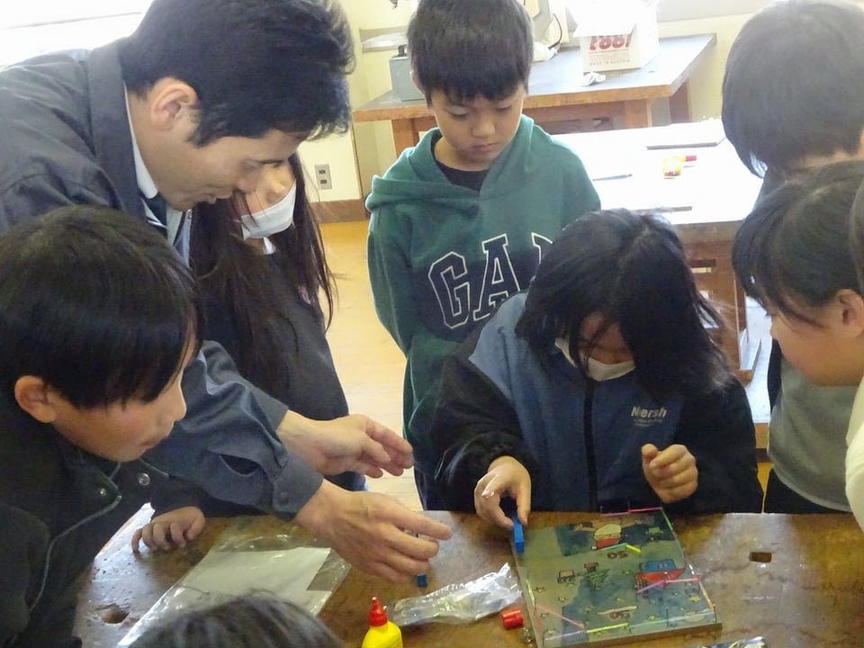 授業が進むにつれ、教室には「トントン」と小気味よい音が響き渡りました。子どもたちは、中学校の先生のアドバイスをいかしながら、くぎを打ち込んで思い思いの作品づくりに没頭していました。