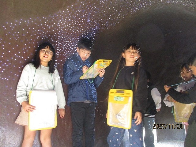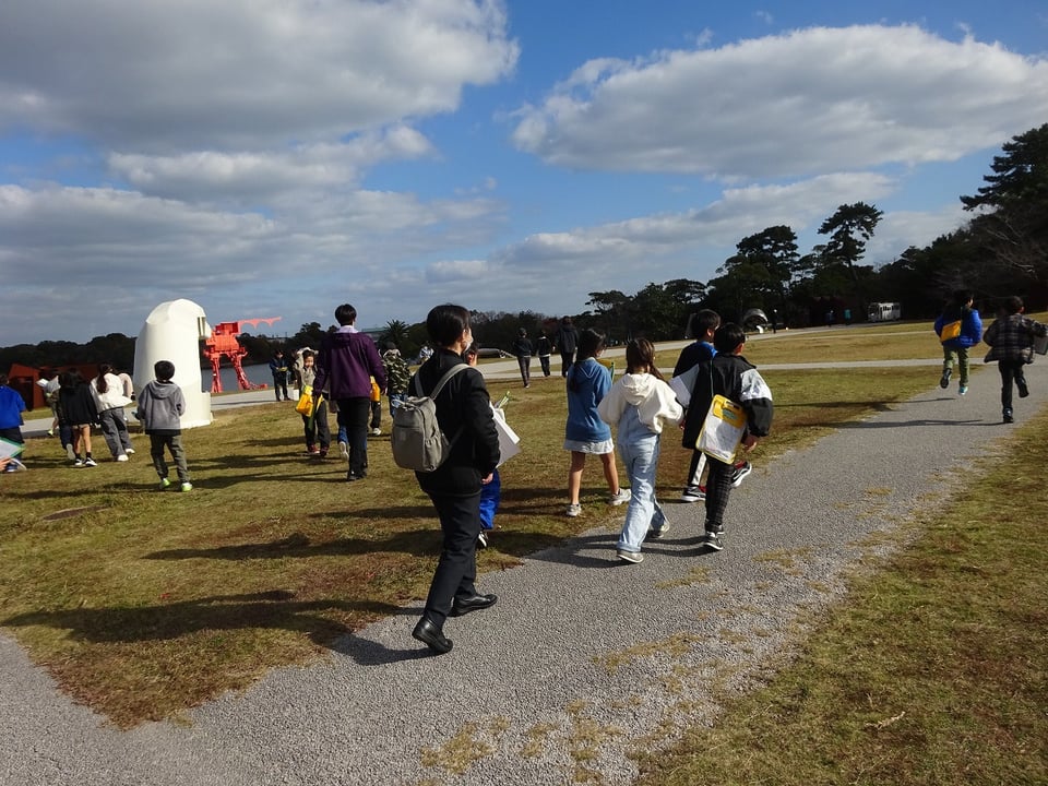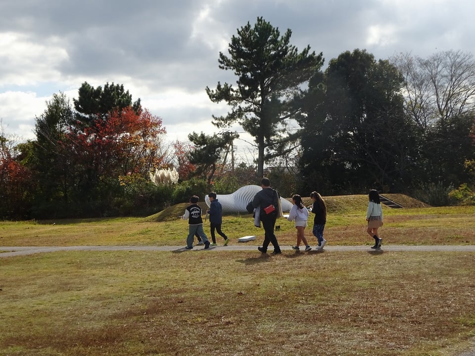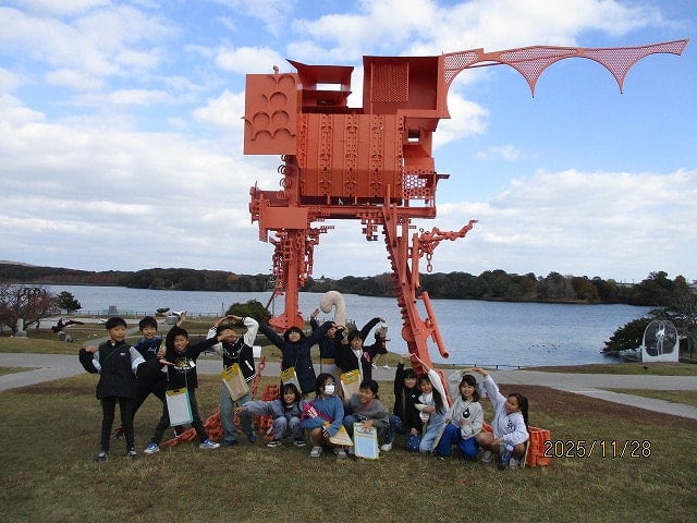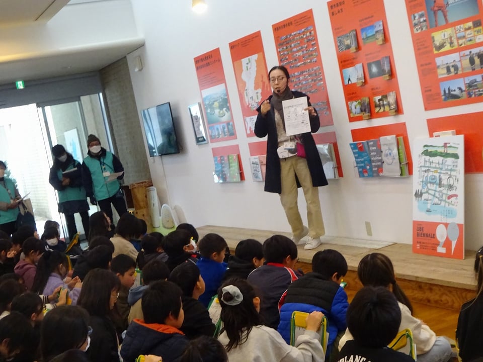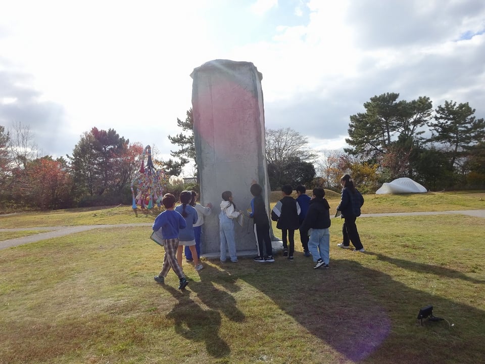 宇部市が実施する、市内小学校4年生を対象に、「きみはどうかんじる? 彫刻の丘一周コース」と題し、「ひらめき!みつけて!おしえて!」を合言葉に、子供たち自身で彫刻を発見し、彫刻に触れることで生まれる感覚を言葉にして共有する鑑賞プログラムを4年生が体験しました。