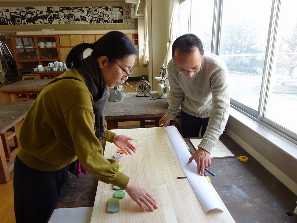 児童一人ひとりが、校内の思い出の場所や教室の備品、グラウンドの器具などをモチーフに下書きをして、糸のこで切り抜き、彫刻刀で丁寧に模様を刻みました。水彩絵の具で着色された個性豊かなパーツを、一つの大きなレリーフに組み合わせていきます。完成した作品は、見初小学校の新体育館にあるげた箱の上に設置される予定です。