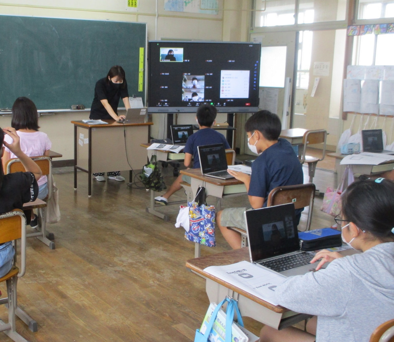1人1端末の利点を生かして、リモートでも授業ができるよう、ZOOMで、会話やチャットをする練習をしています。
