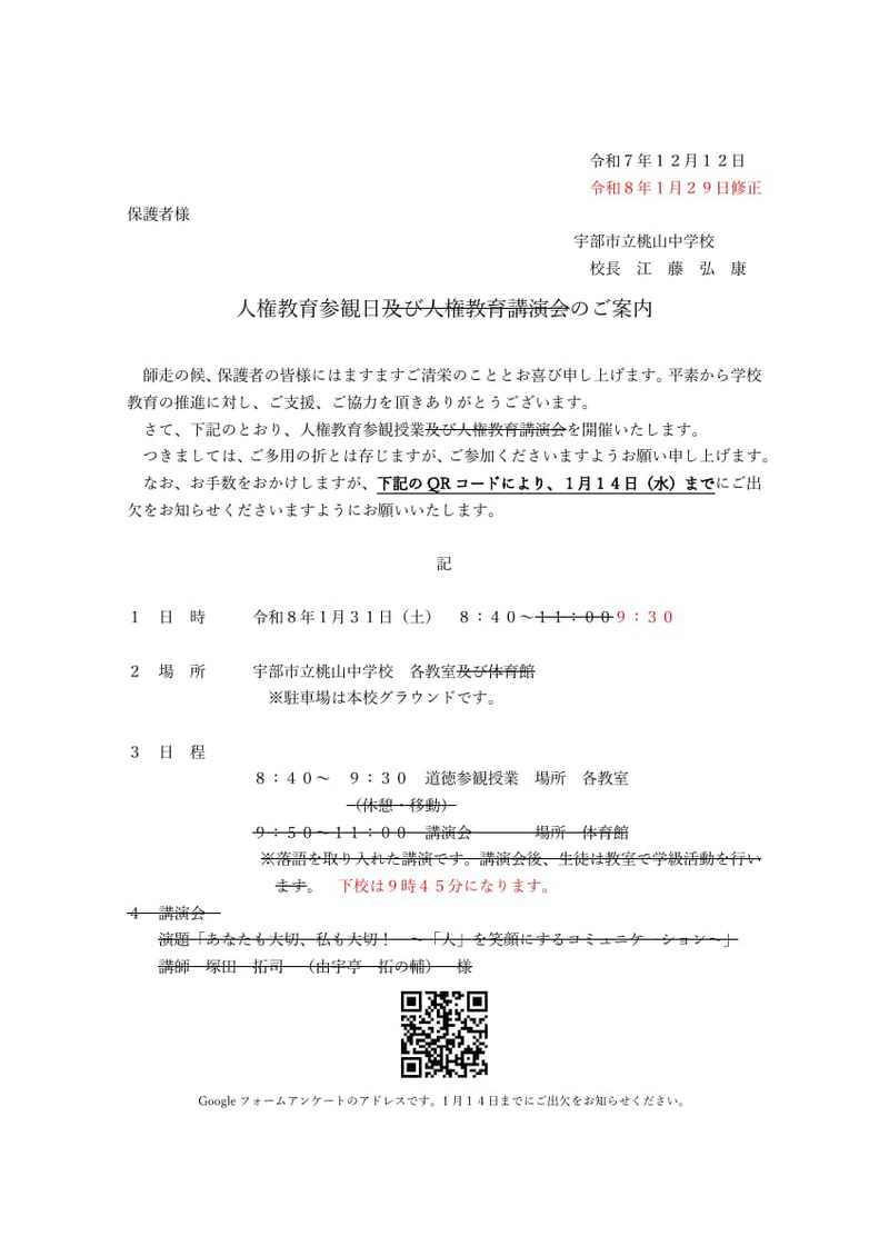 感染拡大防止のため人権教育参観日の講演会を中止します。