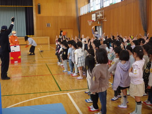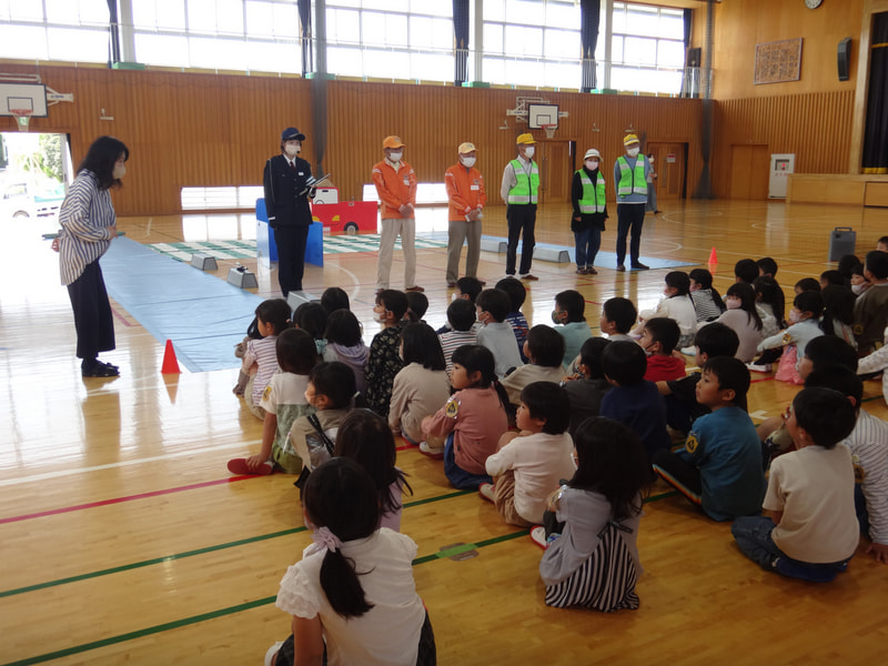 警察の方、地域の交通指導員の方に来ていただき、ていねいに渡り方、歩き方を教えていただきました。