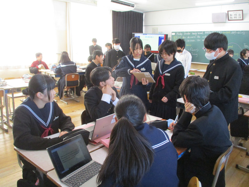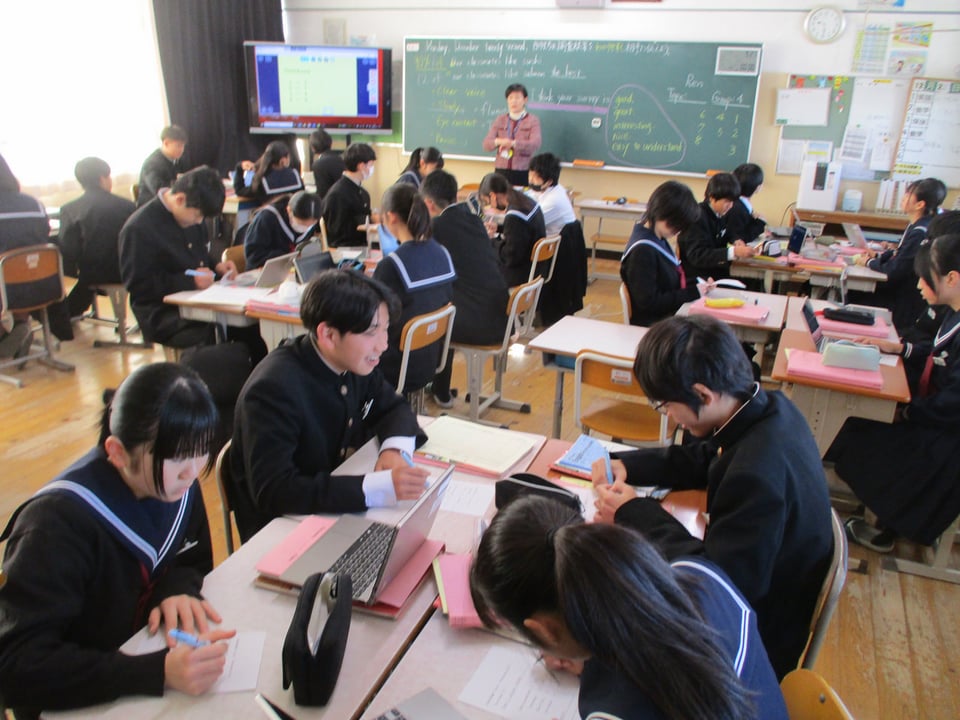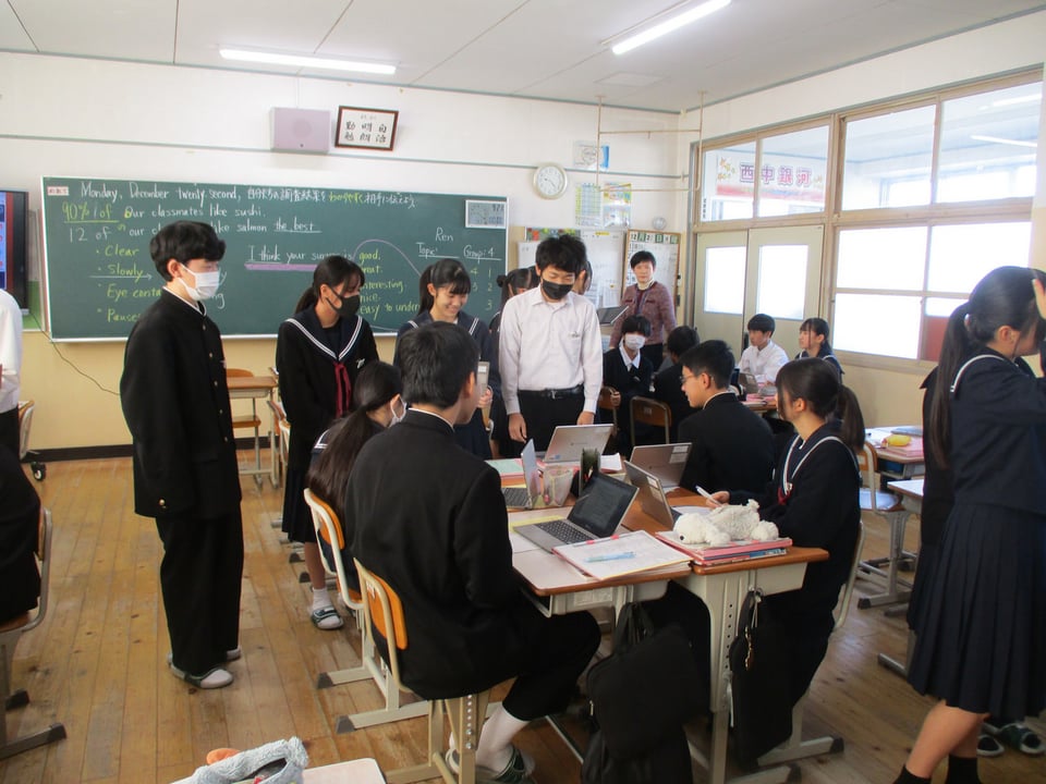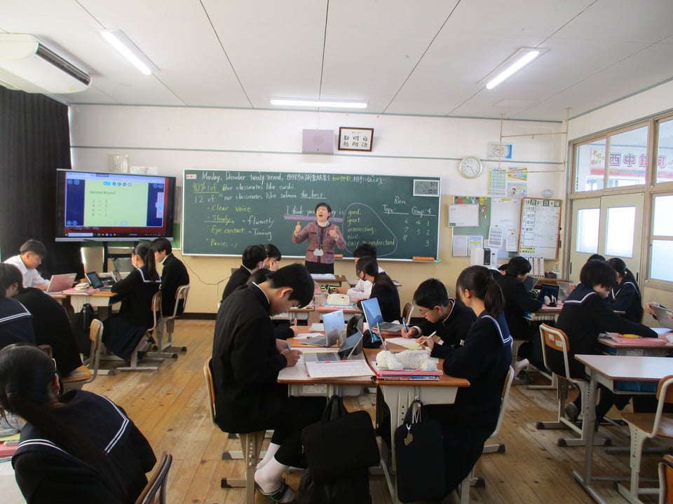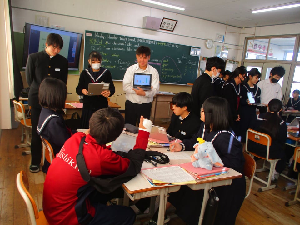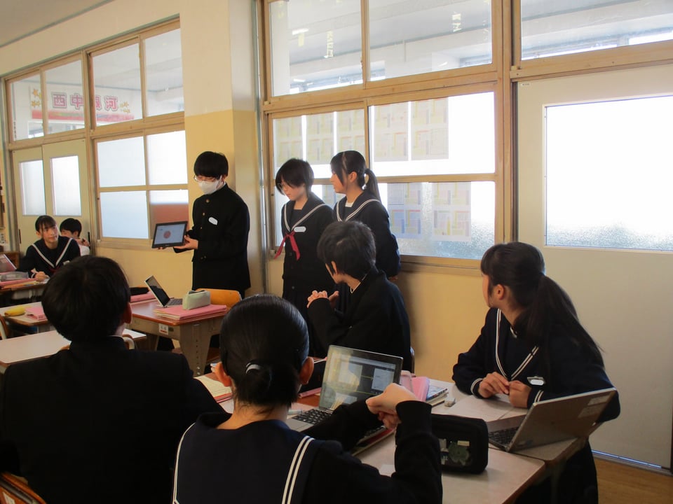 2年生英語の「How can we make a good presentation?」の授業で、自分たちの調査結果をタブレットを使いながら、比較級などの表現を使って、他の班に伝える活動を行いました。