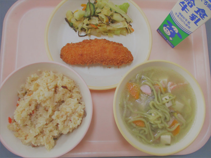 本日のメニューは、タケノコごはん、小野茶麺汁、白身魚フライ、塩こんぶ和えでした。