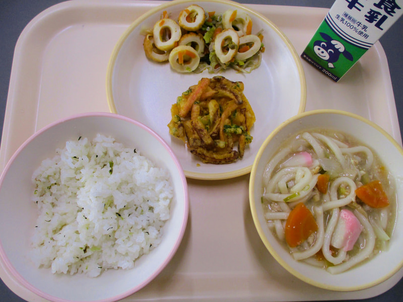本日のメニューは、小菜飯、かきあげうどん、野菜のじゃこ炒めでした。