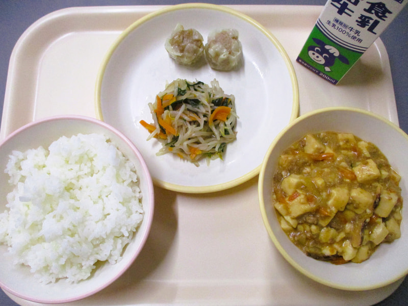 本日のメニューは、ごはん、マーボー豆腐、しゅうまい、もやしの塩炒めでした。