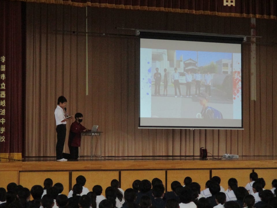 その中で、来週末行われる県新人大会の壮行式と、表彰・校納の披露、生活委員長による小中合同あいさつ運動についての報告がありました。