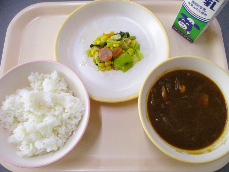 本日のメニューは、ごはん、ハヤシライス、チンゲン菜のソテーでした。