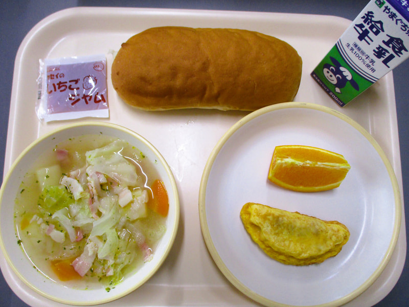 本日のメニューは、パン、いちごジャム、じゃがいもとベーコンのスープ、ミートオムレツ、オレンジでした。
