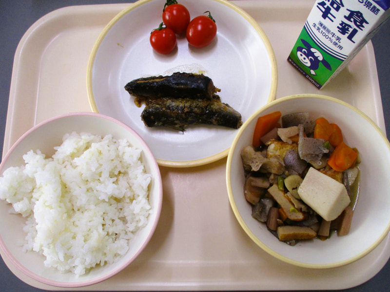 本日のメニューは、ごはん、筑前煮、いわしのみぞれ煮、ミニトマトでした。
