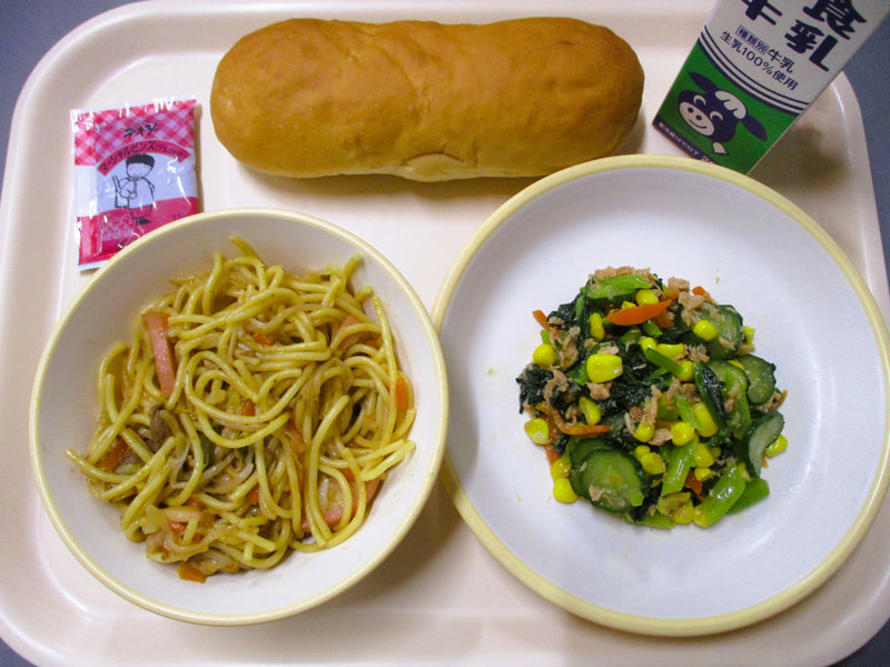 本日のメニューは、小パン、マーシャルビーンズ、焼きそば風スパゲティ、小松菜サラダでした。