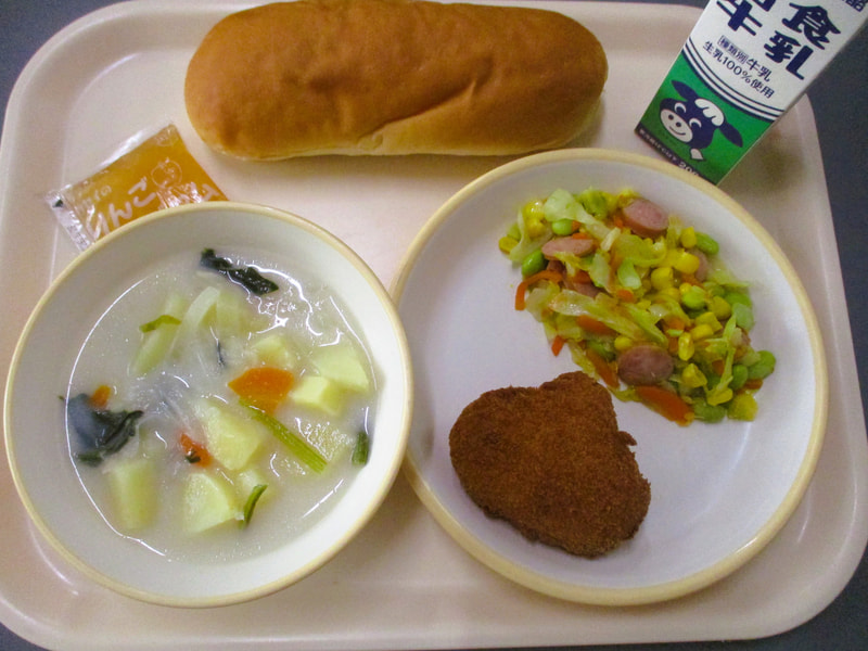 本日のメニューは、パン、りんごジャム、白いんげん豆の豆乳スープ、焼き栗コロッケ、カラフルソテーでした。
