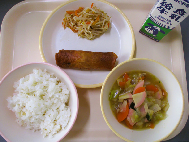 本日のメニューは、ごはん、八宝菜、春巻き、もやしの甘酢炒めでした。