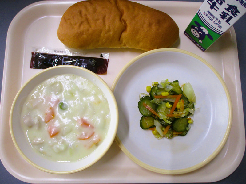 本日のメニューは、パン、パテチョコレート、クリームシチュー、ぷちぷちサラダでした。