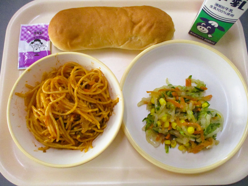 本日のメニューは、小パン、レーズンクリーム、ミートソーススパゲティ、大根サラダでした。