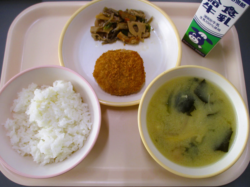 本日のメニューは、ごはん、みそ汁、県産チキンカツ、豚肉とれんこんの炒め物でした。