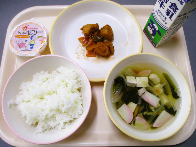 本日のメニューは、ごはん、豆腐汁、肉団子の甘酢あん、県産みかんゼリーでした。