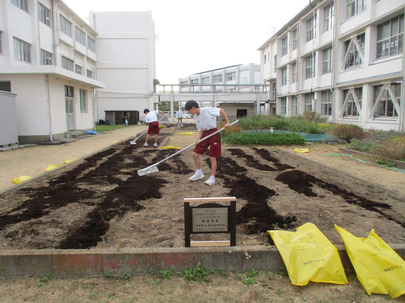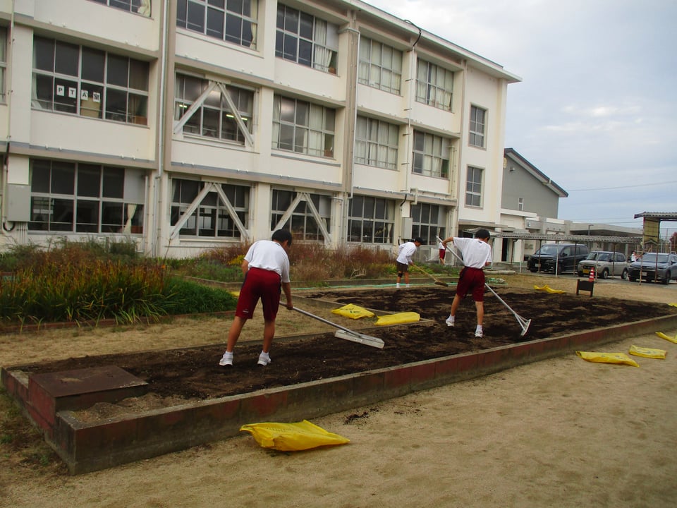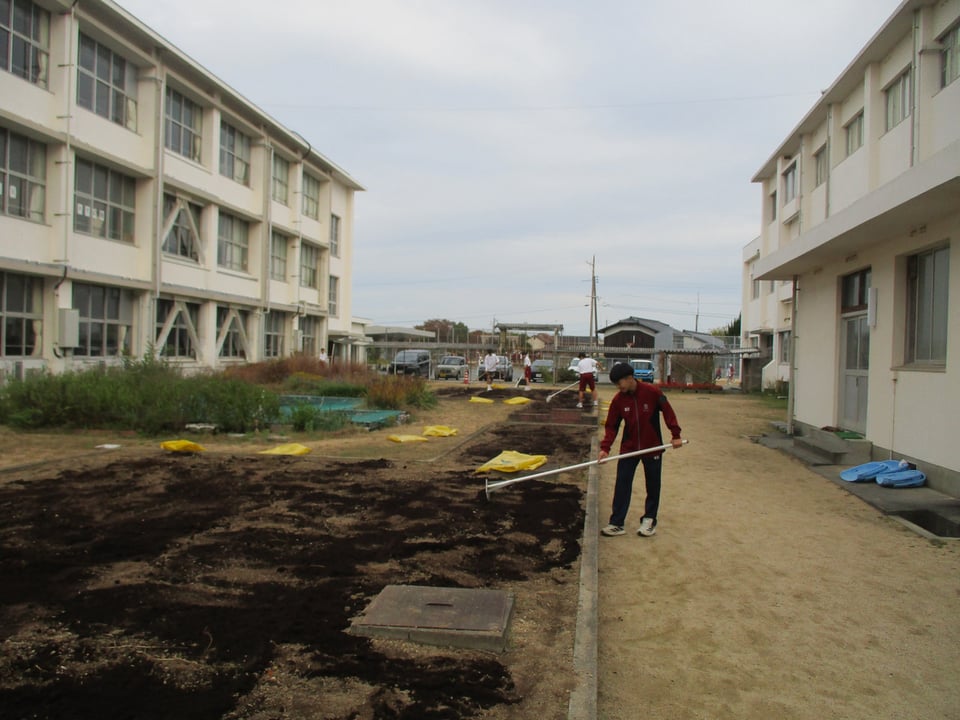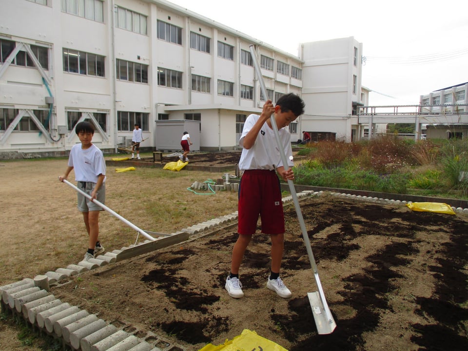 本日放課後、男子バスケットボール部が中庭花壇の整備をしていました。
