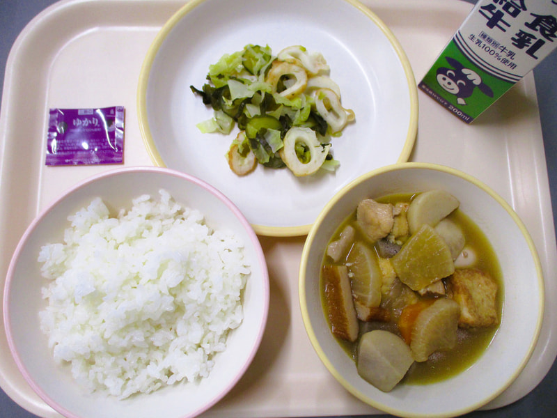 本日のメニューは、ごはん、ゆかりふりかけ、煮込みおでん、わかめときゅうりの甘酢煮でした。