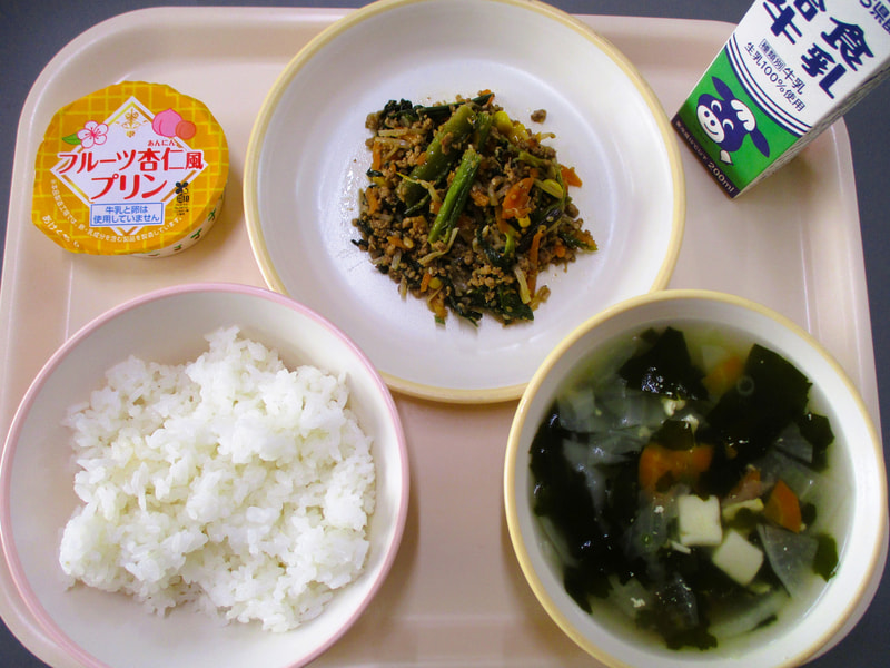 本日のメニューは、ごはん、わかめスープ、ビビンバの具、フルーツ杏仁風プリンでした。