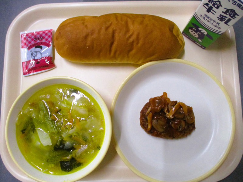 本日のメニューは、パン、マーシャルビーンズ、マカロニスープ、ハンバーグのきのこソースでした。