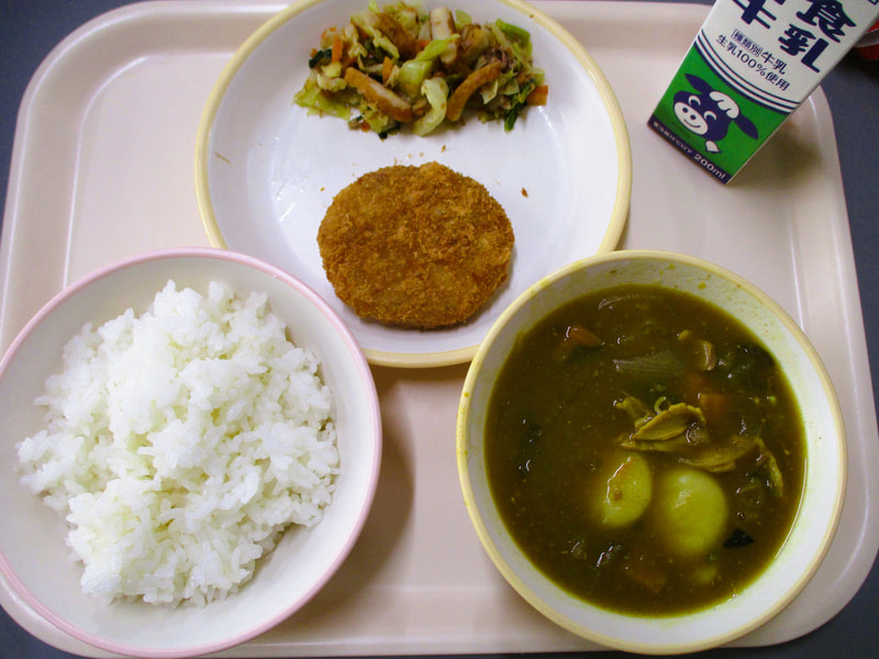本日のメニューは、ごはん、カレー風すいとん汁、メンチカツ、野菜のおかか炒めでした。