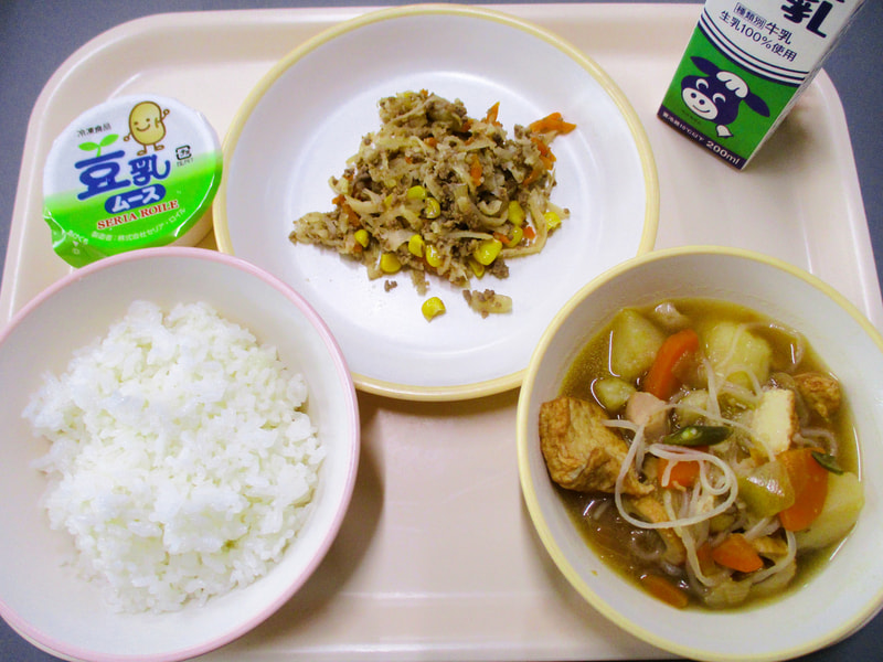 本日のメニューは、ごはん、じゃがいものうま煮、シャキシャキそぼろ丼の具、豆乳ムースでした。