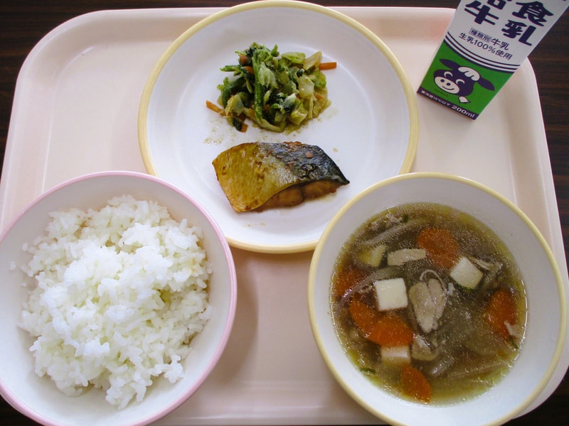 本日のメニューは、ごはん、のっぺい汁、さばのみりん焼き、野菜のごま和えでした。