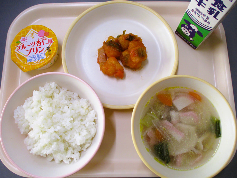 本日のメニューは、ごはん、水ぎょうざスープ、白身魚のチリソース、フルーツ杏仁風プリンでした。