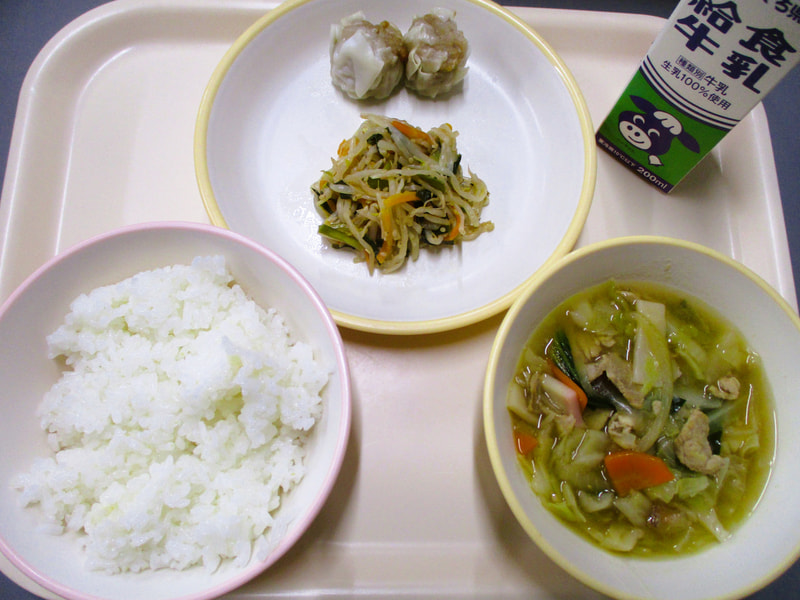 本日のメニューは、ごはん、中華丼、しゅうまい、もやしのポン酢炒めでした。