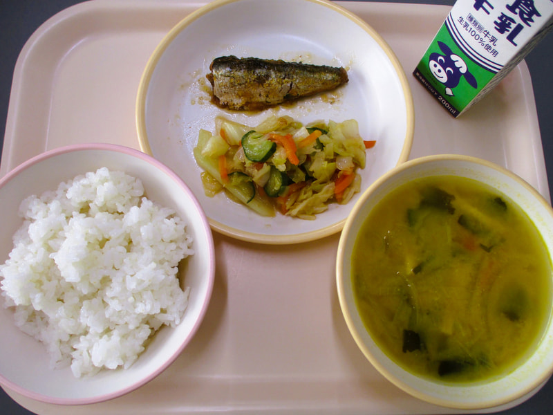 今学期最後のメニューは、ごはん、かぼちゃのみそ汁、いわしのみぞれ煮、ゆずきち和えでした。